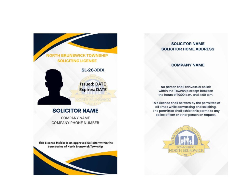 This is what an official Township-issued solicitor permit looks like. This permit must be worn around the solicitor’s neck and fully visible at all times while soliciting within the Township.